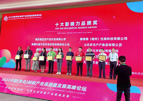 借著辣椒迅猛發(fā)展的勢頭,山東省辣椒協(xié)會、青島市辣椒產(chǎn)業(yè)商會、中國食品工業(yè)協(xié)會、山東省食品工業(yè)協(xié)會共同舉辦2023中國(青島)國際辣椒交易博覽會和2023第二十屆中國(青島)國際食品博覽會。本次會議以新食尚、新食機(jī)、擴(kuò)內(nèi)需、促循環(huán)為主題,特邀請行業(yè)專家、產(chǎn)業(yè)代表、國內(nèi)外辣椒產(chǎn)業(yè)鏈龍頭企業(yè)代表齊聚一堂,設(shè)置包括前沿分享、主題沙龍、頒獎典禮等多個環(huán)節(jié),全方位、多視角共話辣椒產(chǎn)業(yè)相關(guān)政策。其中在頒獎環(huán)節(jié),辣妹子憑借出眾的品牌影響力和產(chǎn)品研發(fā)創(chuàng)新力,一舉斬獲“十大受歡迎影響力品牌獎”,收獲了來自行業(yè)的高度認(rèn)可。